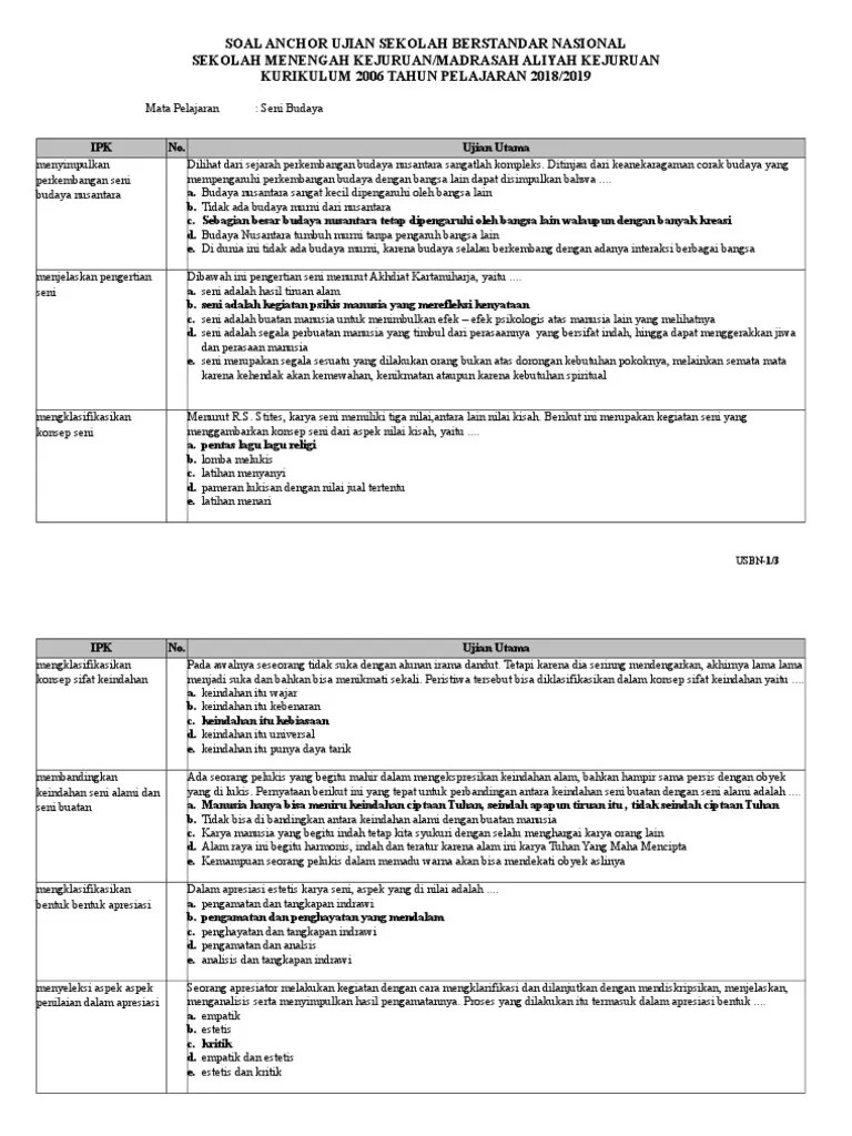 Unduh naskah soal latihan ujian sekolah dan kunci jawaban usbn smp/mts tahun ajaran 2018/2109 mapel seni budaya.